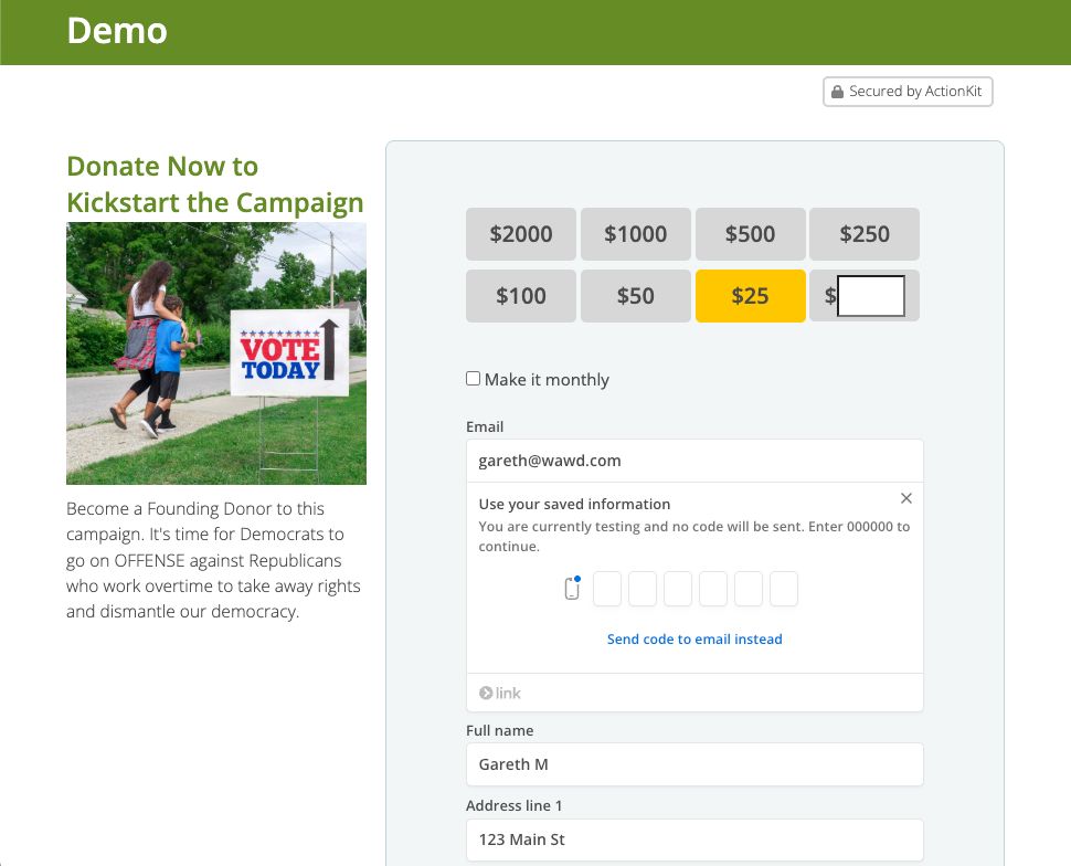 For users clicking to NGP VAN Payments in ActionKit donation page from email, we now prefill the user's name, email, and address. This helps to save typing, but also makes it easier for your donors to take advantage of Stripe Link. Link is Stripe's shared pool of payment details, and tests of our donation pages show more donors using a saved Stripe Link profile than providing a credit card.